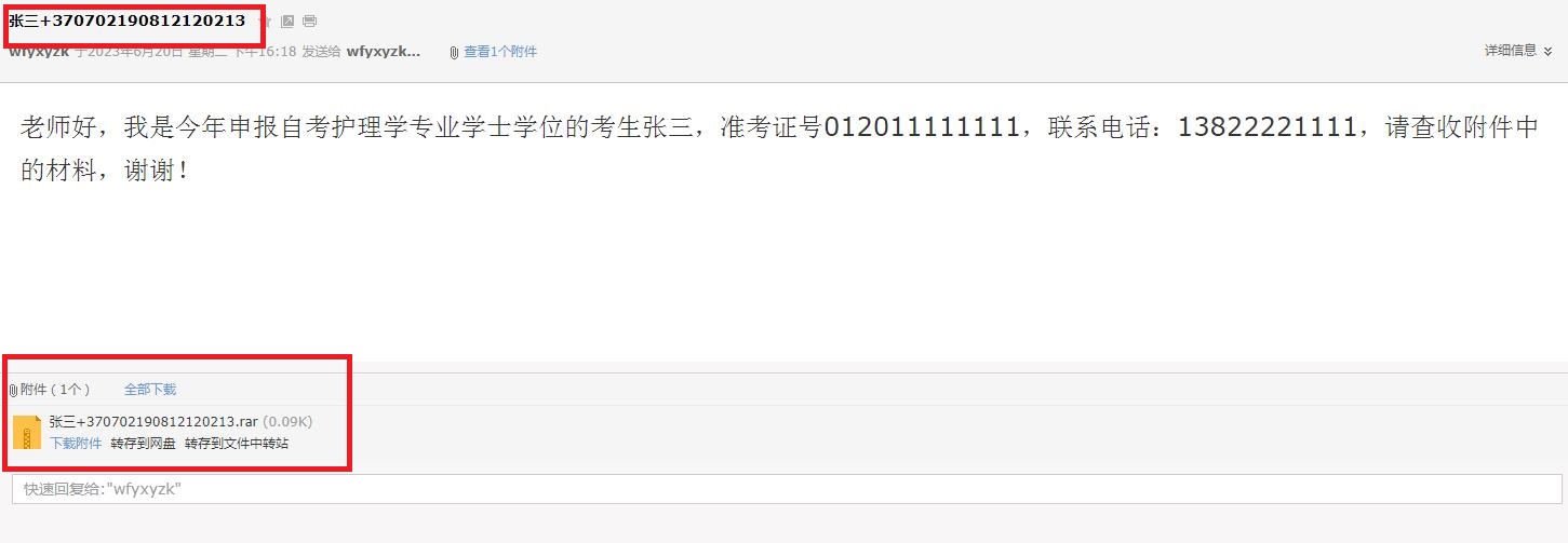 (三)发送要求:考生将论文电子版、查重报告电子版和汇总表放在同一个文件夹,将该文件夹压缩成一个文件包。压缩文件包命名为:考生姓名+身份证号。压缩文件包以电子邮件的附件形式发送。请考生参考本通知附件六样式。